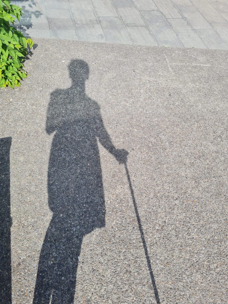 Réponse de la cheffe en moi : « On continue et je guette un siège ! » Je marche lentement : vu mon peu d’équilibre, il y a tout de même peu de risques que mon pied gauche vienne se poser à côté du droit et me fasse choir.